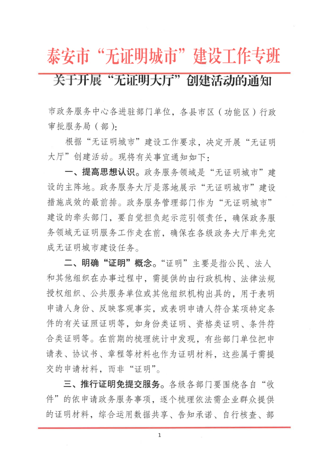 您當(dāng)前位置》政策法規(guī)》泰安市“無(wú)證明城市”建設(shè)工作專(zhuān)班關(guān)于開(kāi)展“無(wú)證明大廳”創(chuàng)建活動(dòng)的通知