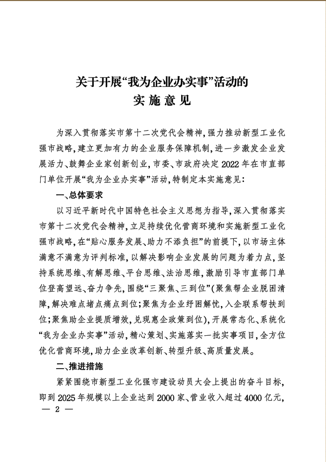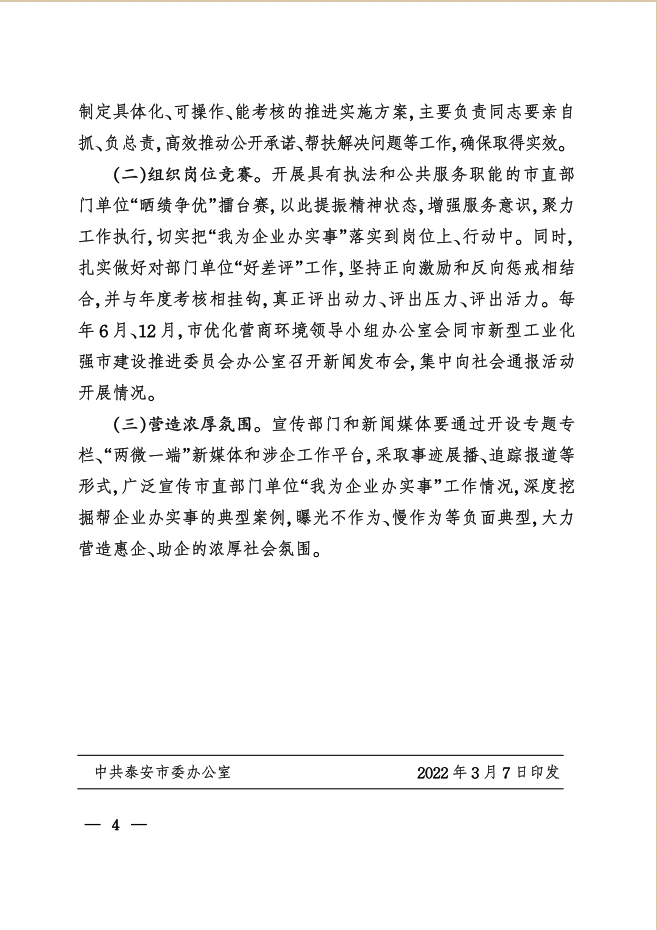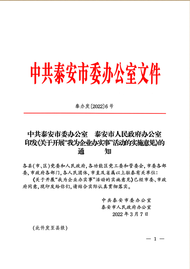 您當(dāng)前位置》政策法規(guī)》中共泰安市委辦公室泰安市人民政府辦公室印發(fā)《關(guān)于開(kāi)展“我為企業(yè)辦實(shí)事”活動(dòng)的實(shí)施意見(jiàn)》的通知
